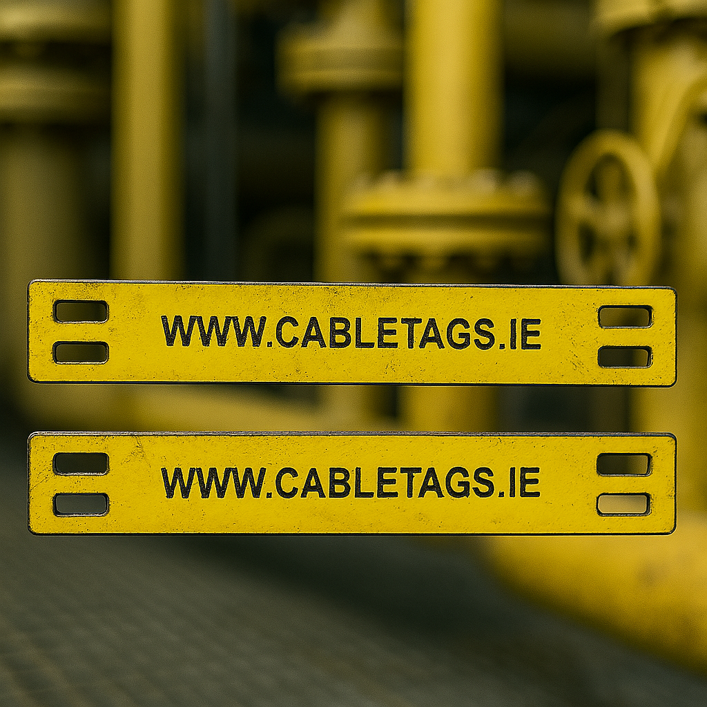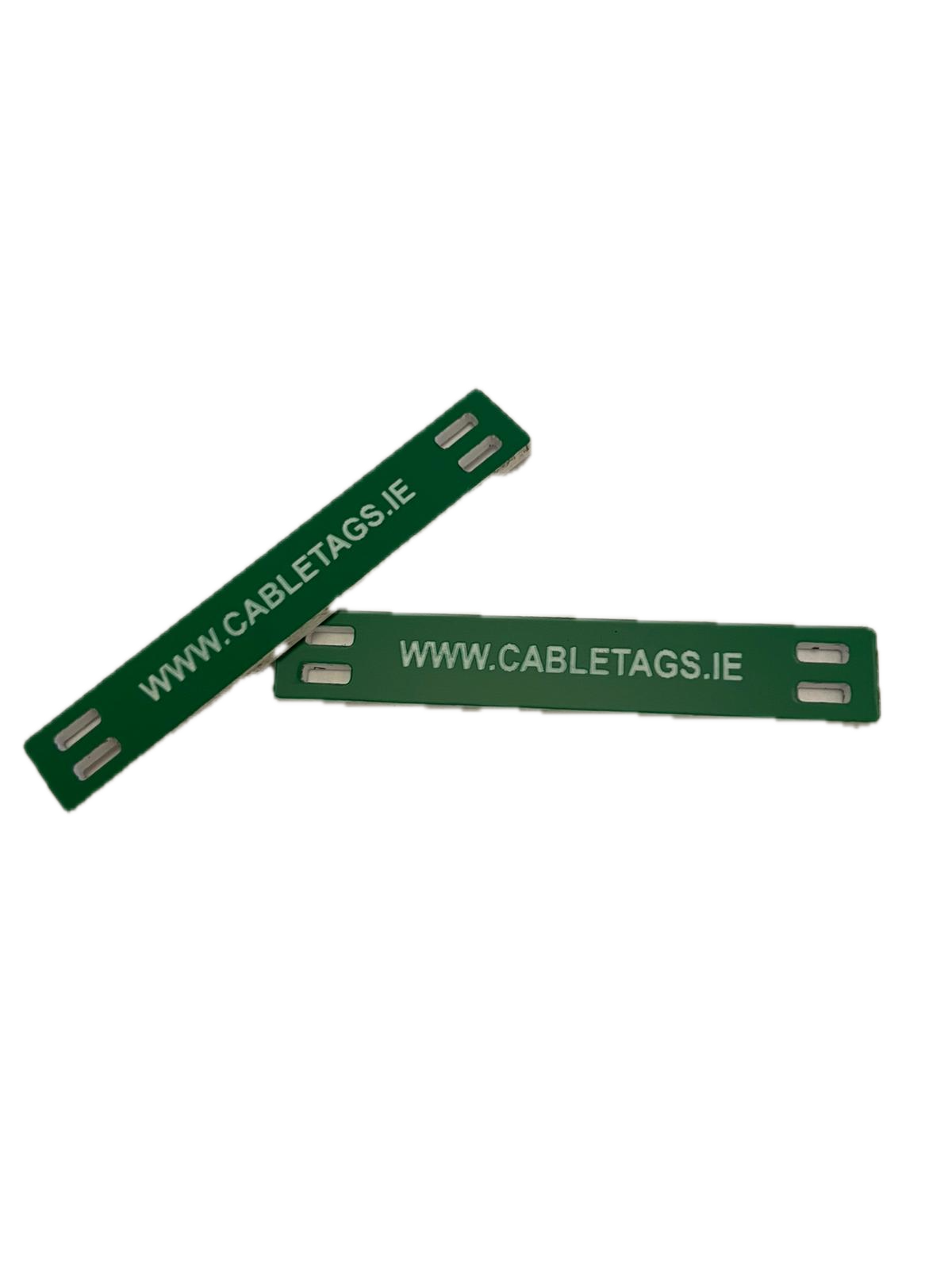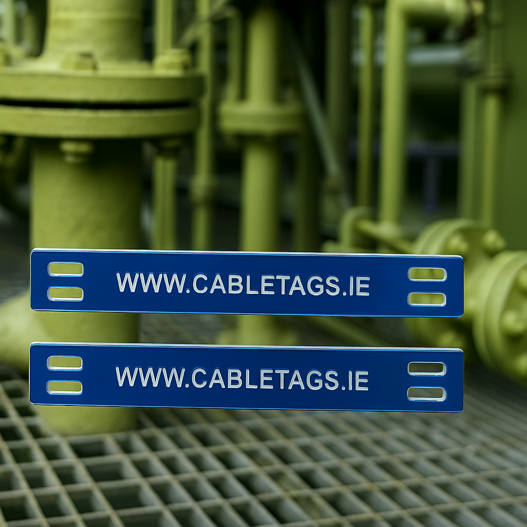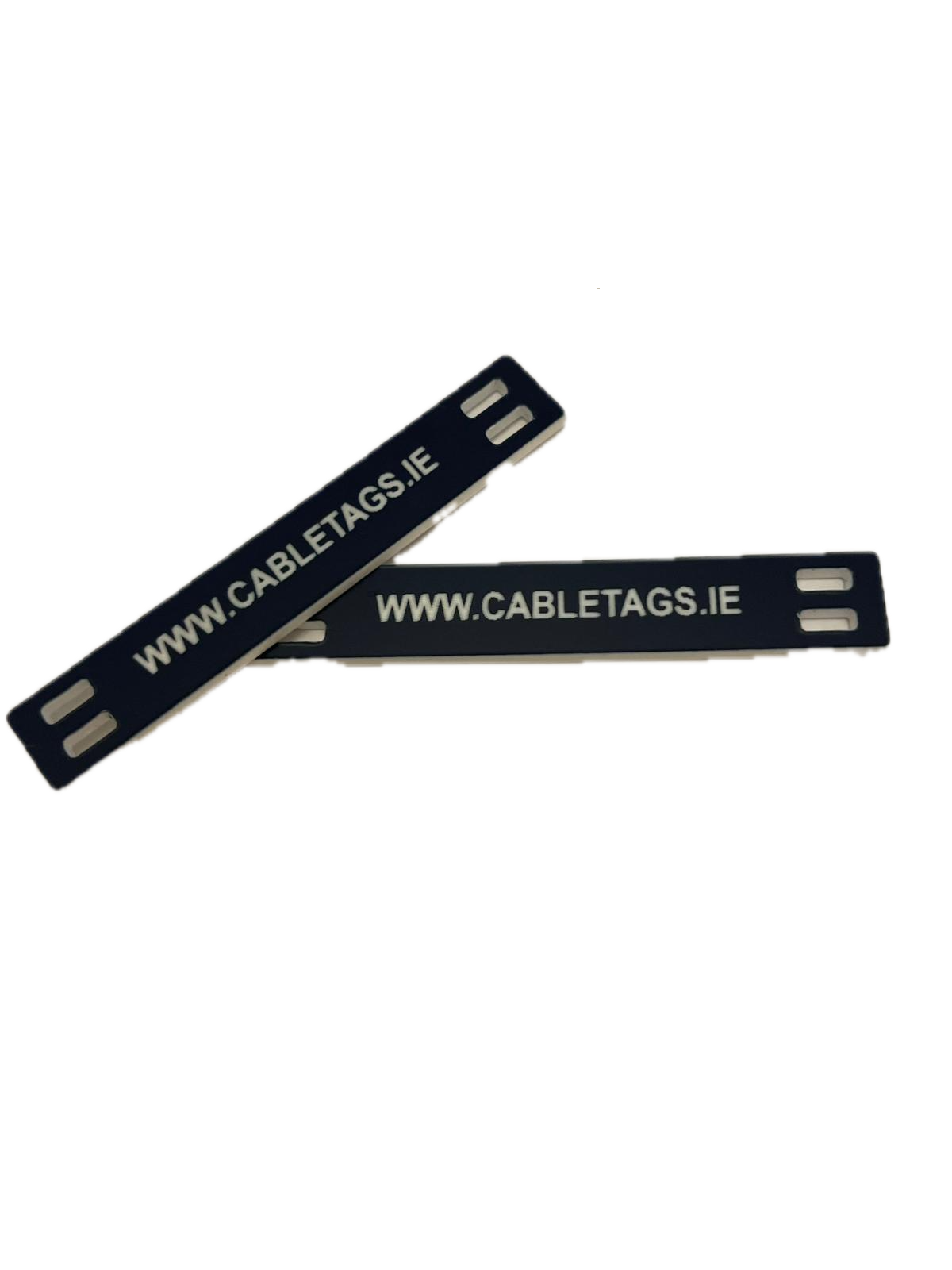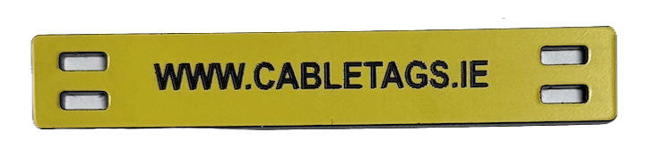 76 x 13mm laser-engraved Traffolyte cable-tie labels, 1.6mm thick. These labels feature rounded corners and four slots at each end for cable ties. The text is carefully positioned to avoid interference from the cable ties, ensuring clear legibility.