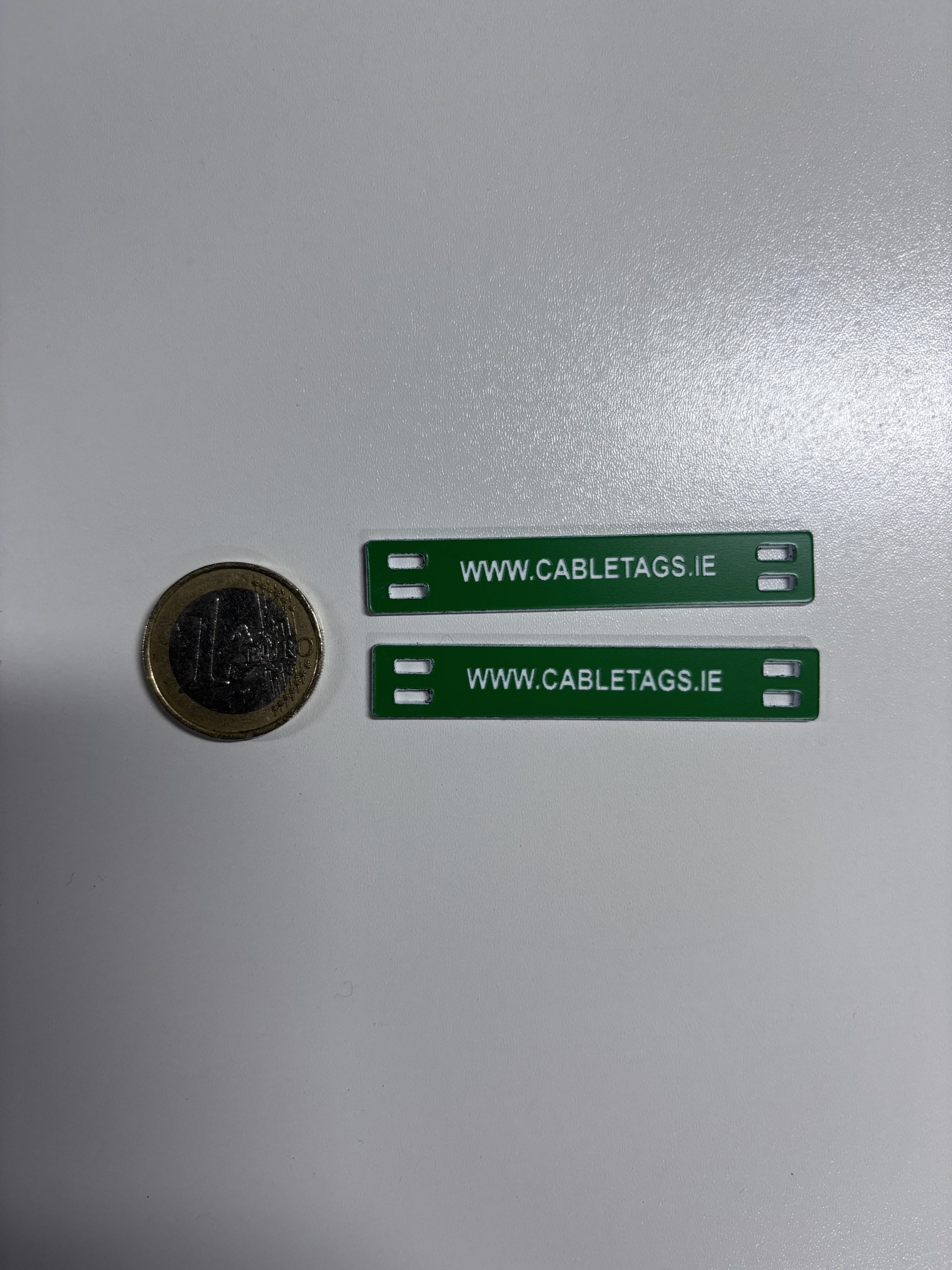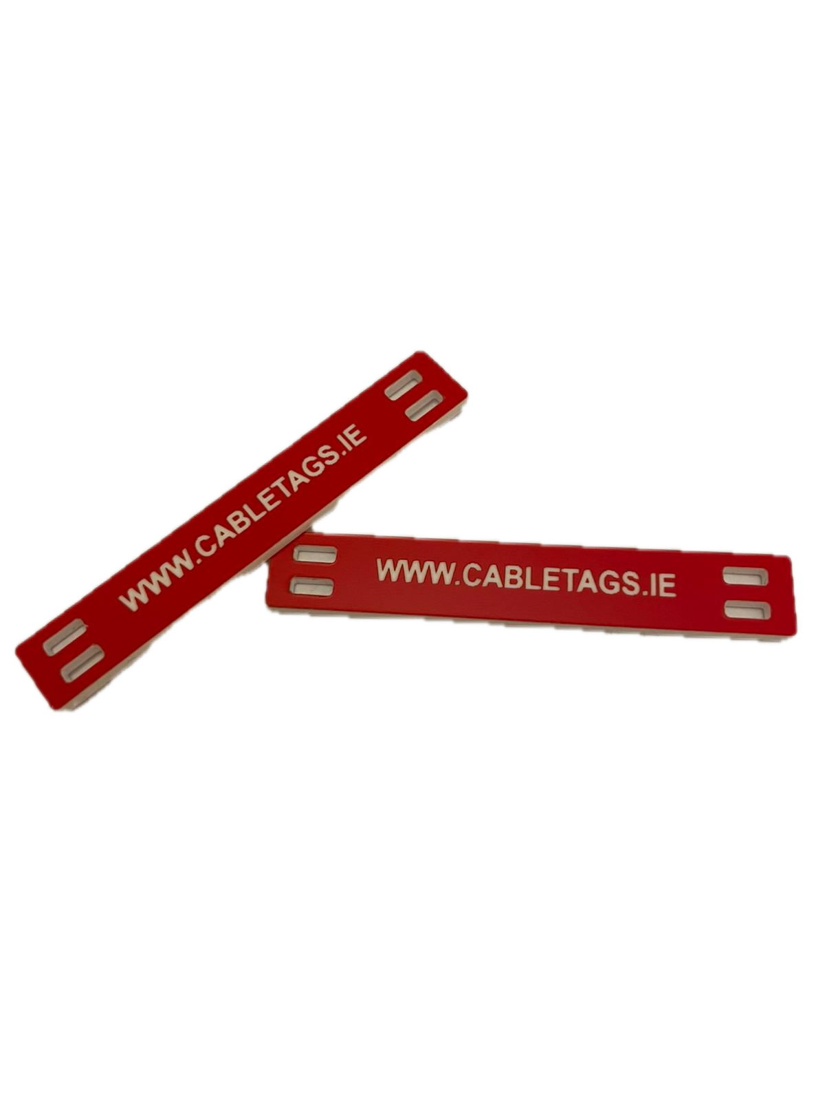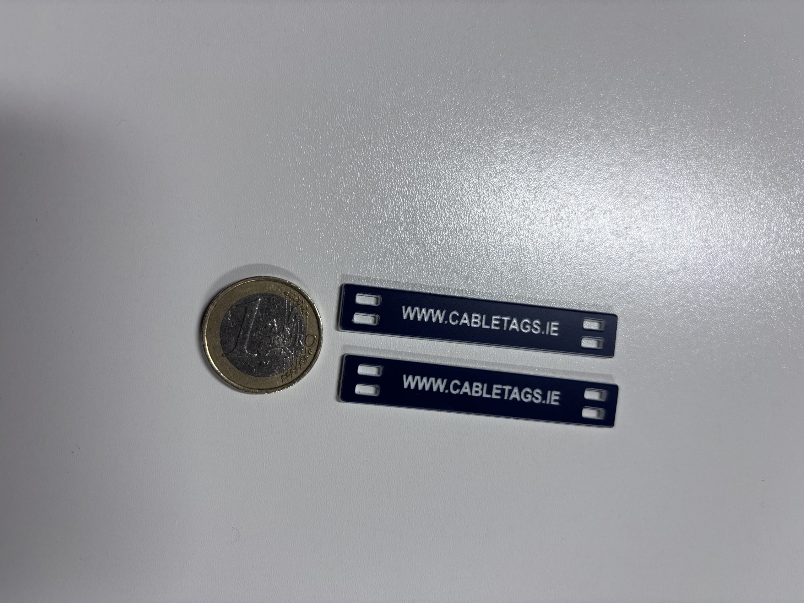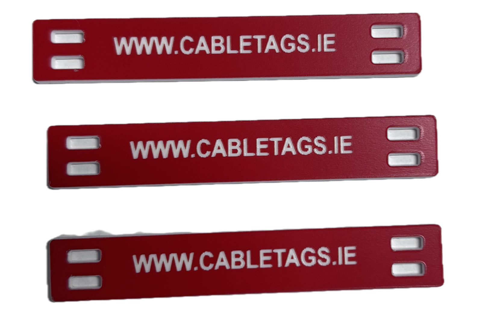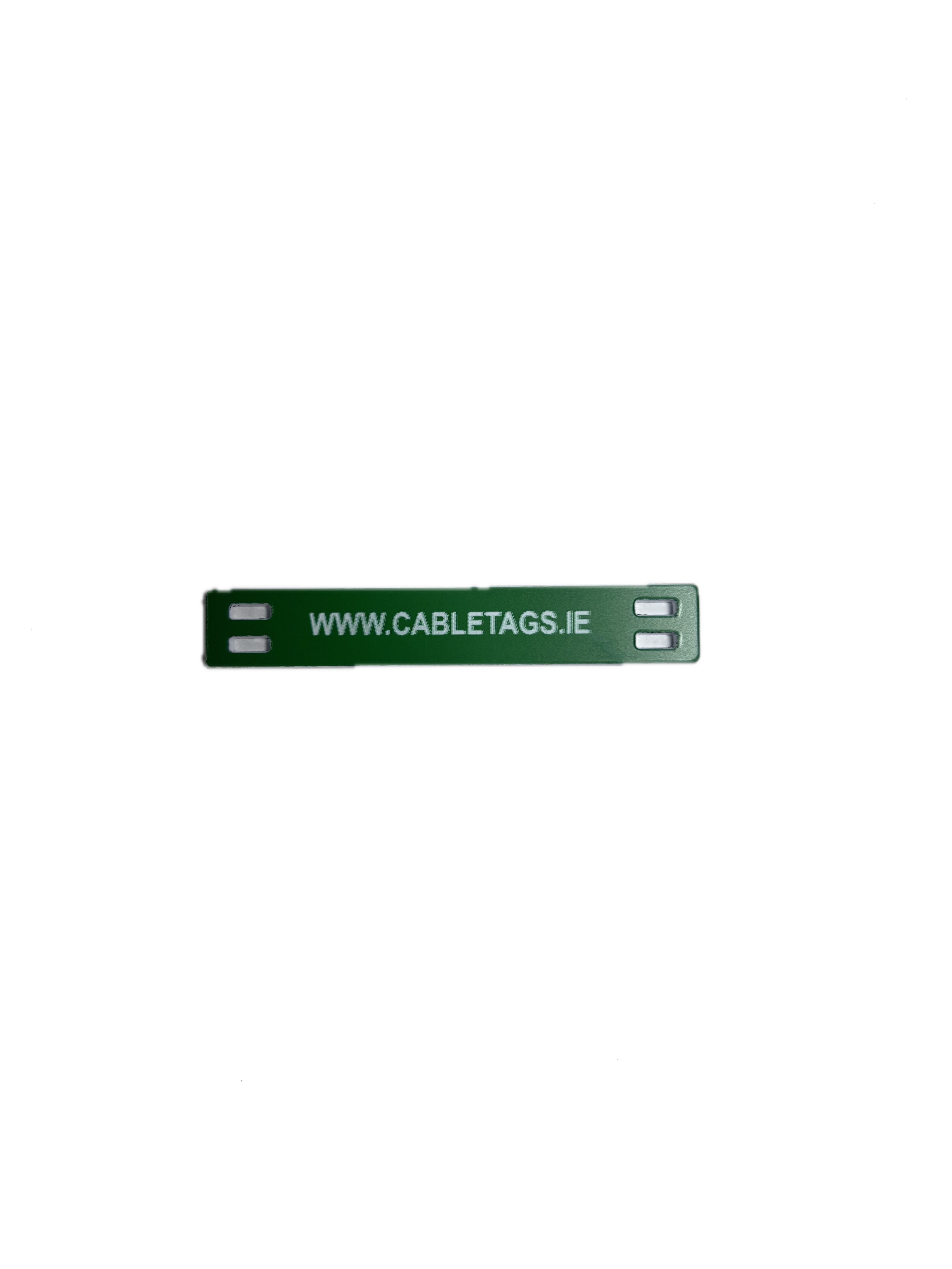 76 x 13mm laser-engraved Traffolyte cable-tie labels, 1.6mm thick. These labels feature rounded corners and four slots at each end for cable ties. The text is carefully positioned to avoid interference from the cable ties, ensuring clear legibility.