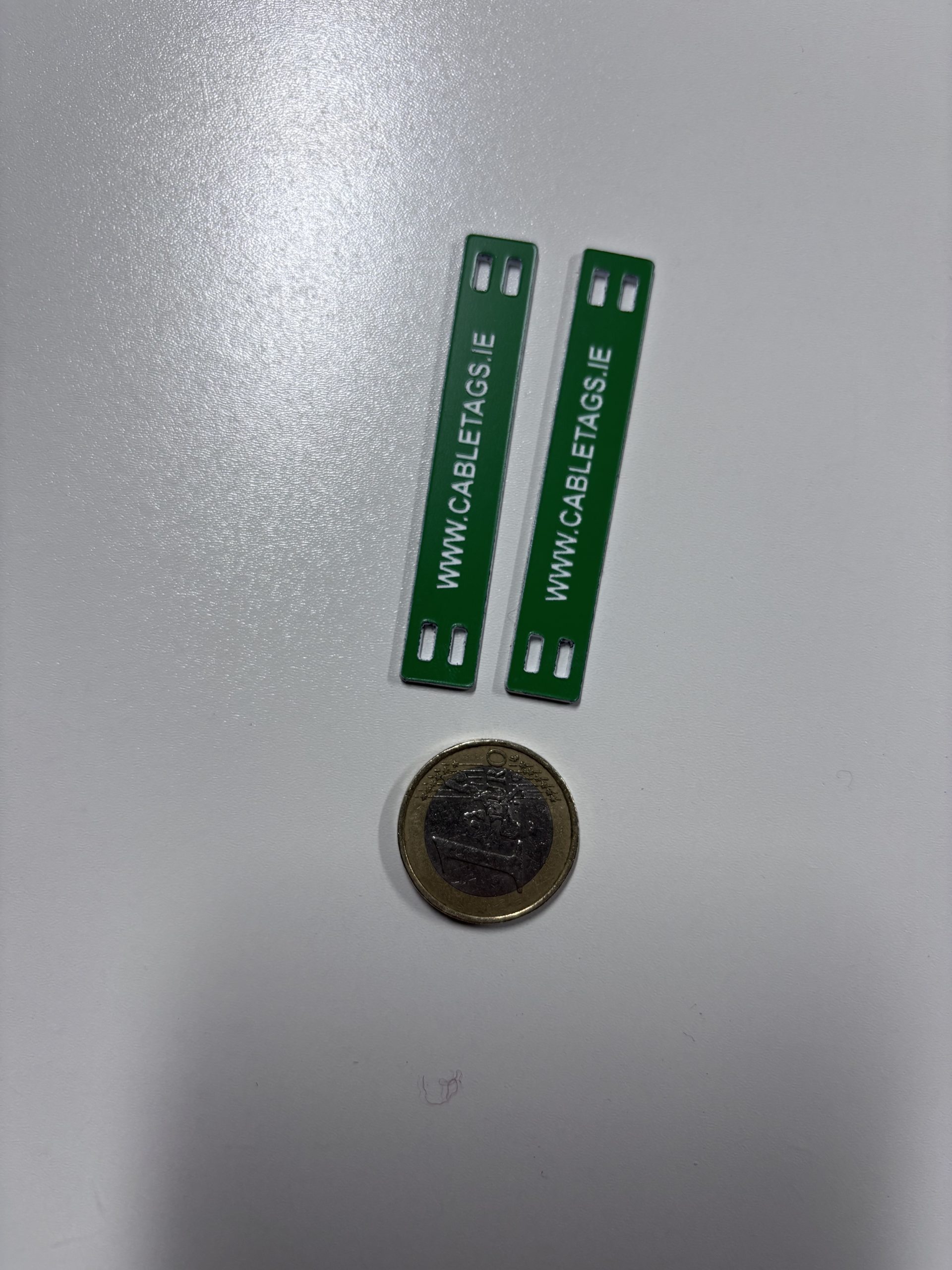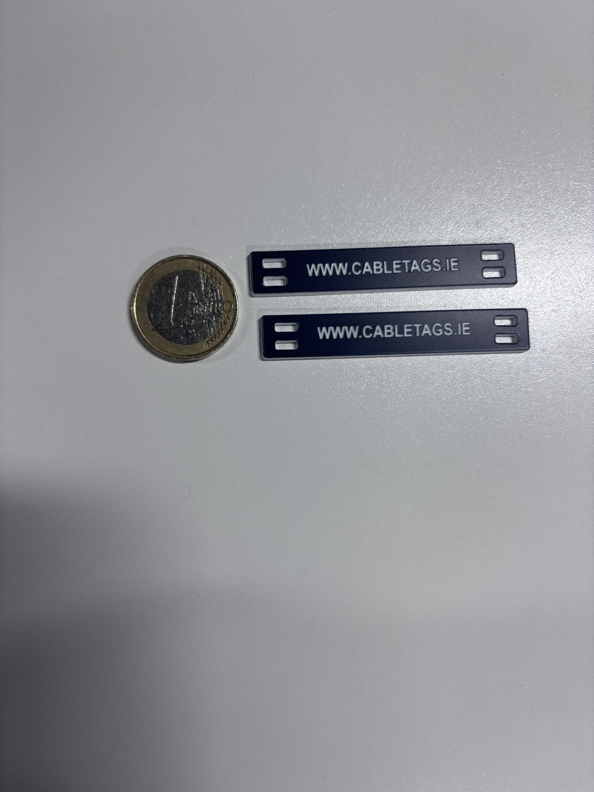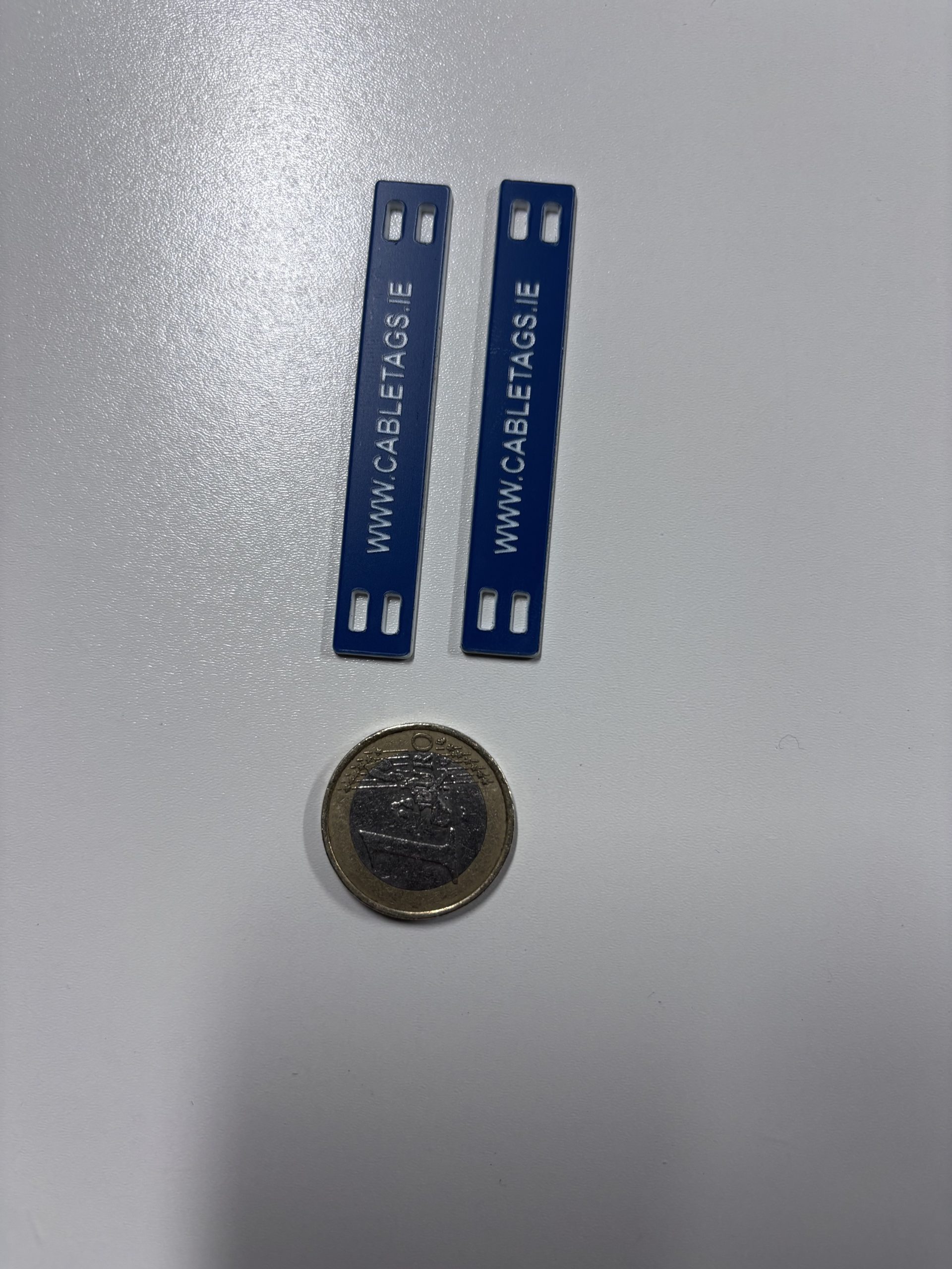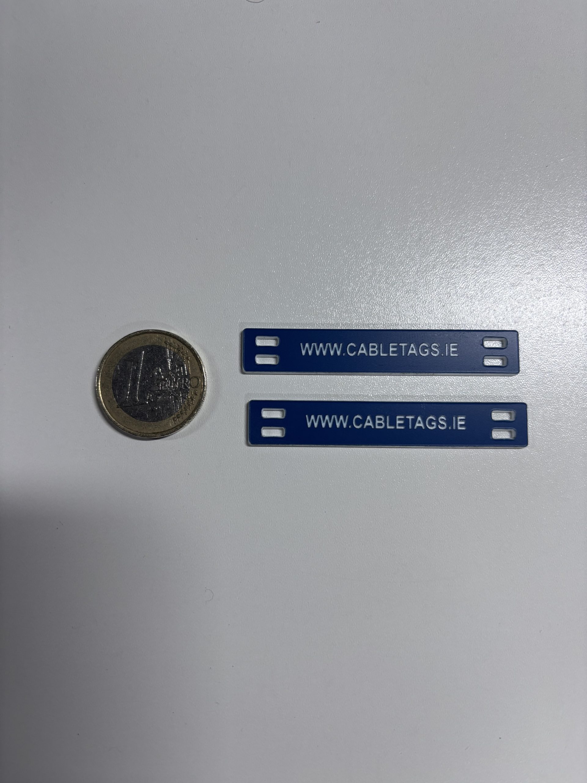 76 x 13mm laser-engraved Traffolyte cable-tie labels, 1.6mm thick. These labels feature rounded corners and four slots at each end for cable ties. The text is carefully positioned to avoid interference from the cable ties, ensuring clear legibility.