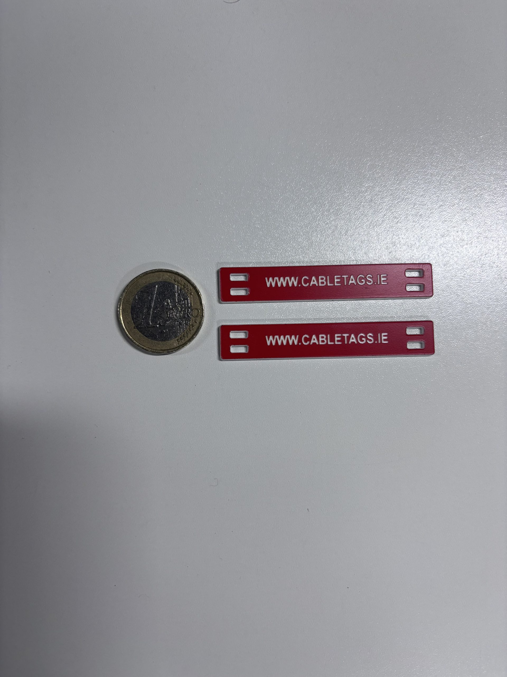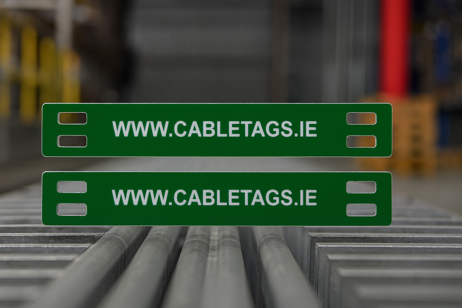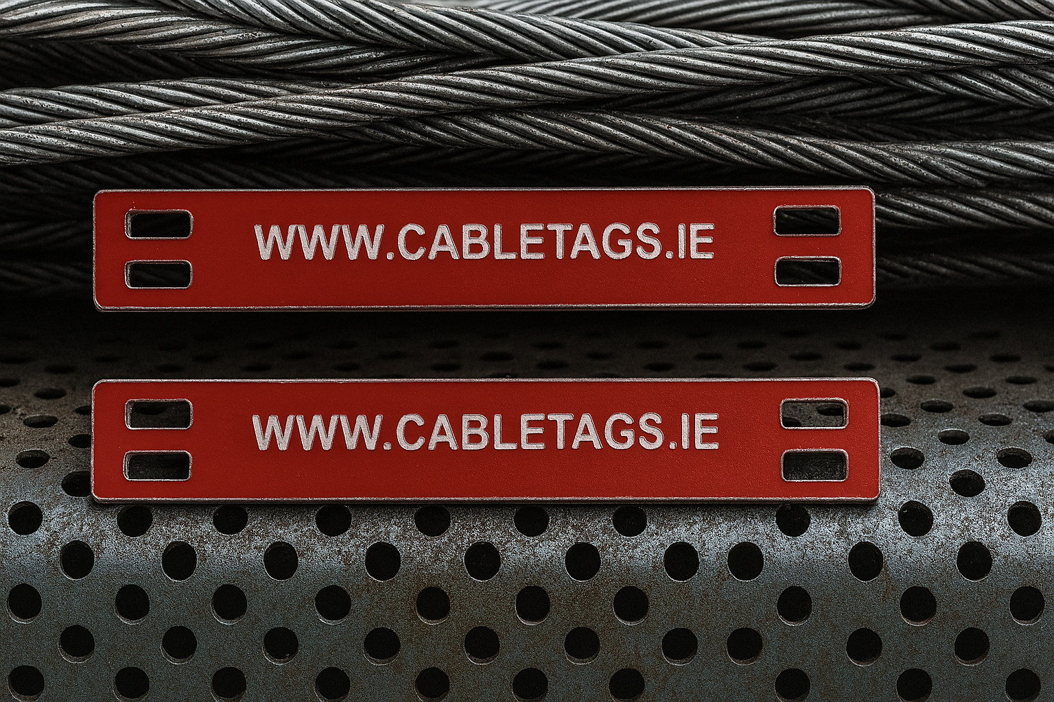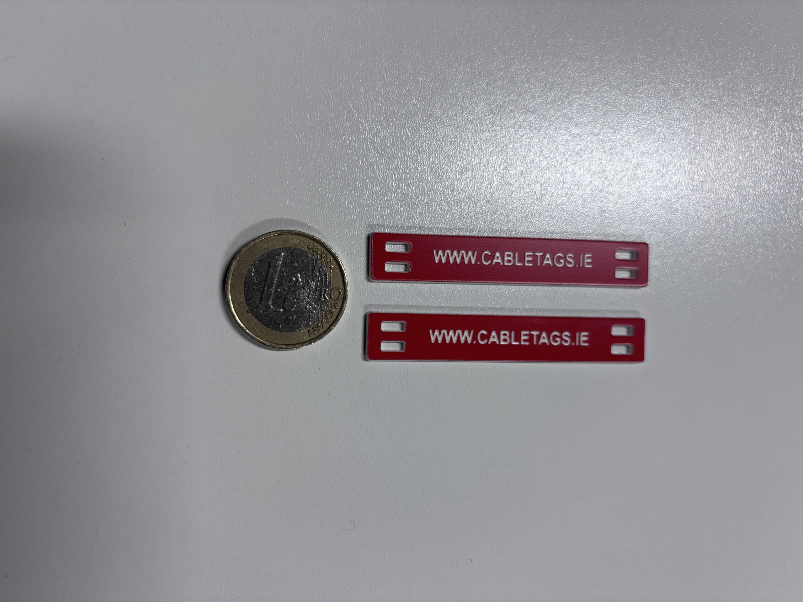 76 x 13mm laser-engraved Traffolyte cable-tie labels, 1.6mm thick. These labels feature rounded corners and four slots at each end for cable ties. The text is carefully positioned to avoid interference from the cable ties, ensuring clear legibility.